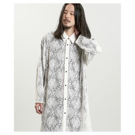 繊細なレース素材を使用し、シアーな透け感が特徴のロングシャツ。オーバーサイズのゆったりとしたシルエットにロング丈を組み合わせることで、軽やかさとエレガントな印象を両立。中性的なデザインがスタイリングの幅を広げ、ジェンダーレスな着こなしを可能にする一着。