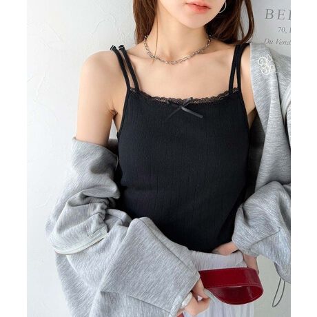 針抜き柄のリブにダブルストラップがオシャレなカップ付きキャミソール。