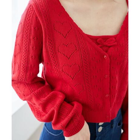 ハート柄の透かし編みデザインがガーリーな雰囲気を醸し出す、カーディガンとキャミソールのセットアイテム。
