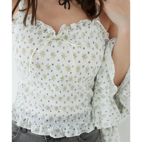 立体感のある細かなシャーリングがアクセントになったカップ付きの花柄キャミソール。