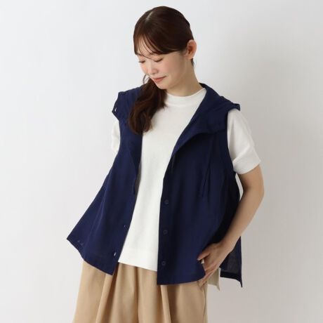 フロントのタックやサイドのギャザーなど細かなデザインをプラスしたフード付ベスト。