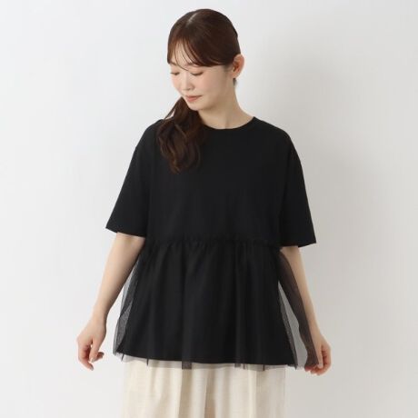 シンプルなカットソーにシアー感のあるチュールを叩きつけた、1枚で着映えするデザインです。