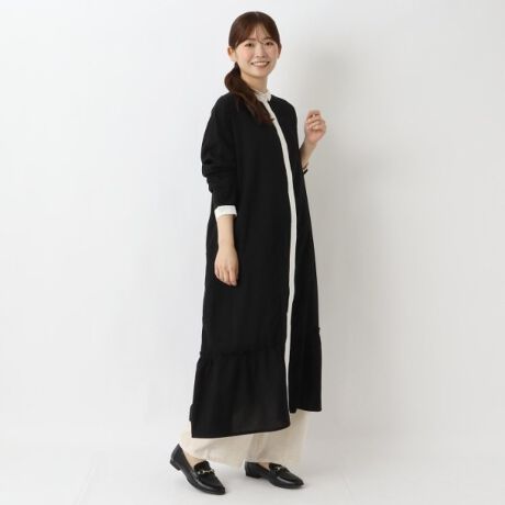 さりげない A ラインシルエットに裾フリルを加えて甘めを足したシャツワンピースです。