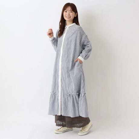 裾ギャザー ロングシャツワンピース