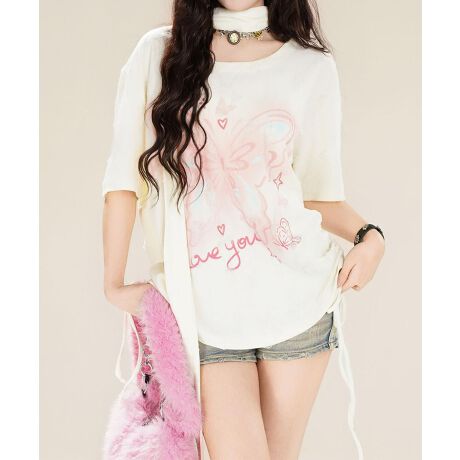 幻想的なバタフライプリントが特徴のTシャツ。付属のスカーフがエレガントなアクセントをプラスし、洗練されたスタイルを演出。サイドのドローストリングデザインにより、シルエットの調整が可能で、お好みのスタイルにアレンジできる。透かし加工が施され、ヴィンテージ感のある仕上がりに。