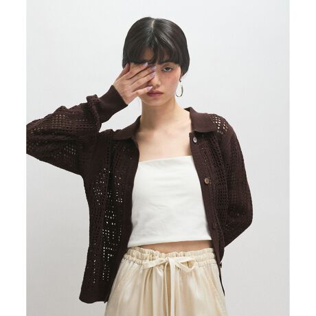 変形したスクエア柄とメッシュをmixさせ、総柄を組みザクっとした編み地に仕上げた一着。