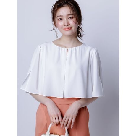 ・ケープデザインとフレア袖が着映えるきれいめブラウス・ゴールドホックがさりげないポイントに・前後着用可能なためお好みの着方ができます