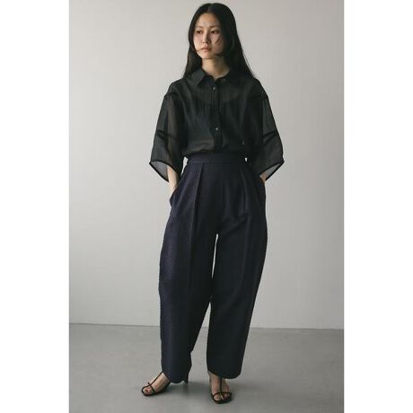 [型番:500ISS31-2871]モデル身長165cm(Mサイズ着用)ドットネップがポイントになるタックを入れたフォルムパンツ。フォルムが女性らしく上品な一枚です。500ISS30-2861(アウトドットショートトップ)とセットアップ着用可能。透け感なし、ストレッチなし。【お手入れ方法】手洗い可