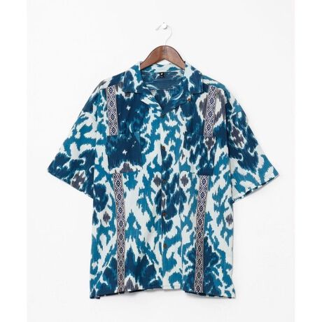 [型番:IAT-5102-2025]通気性がありサラっとした肌ざわりのメンズトップス。ウズベキスタンのイカット柄を渋くまとめた開襟シャツは、インパクト抜群でコーデの主役になる一枚。