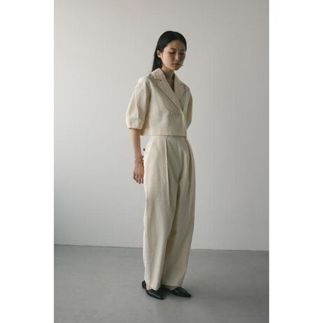 モデル身長165cm(FREEサイズ着用)ドットのようなネップが入った素材感が可愛いショートテーラードトップ。ショート丈でバランスがとりやすく、フォルム袖が映える一枚です。セットアップはもちろん、デニムやスラックス、スカートでも可愛くスタイリングしていただけます。500ISS31-2871(アウトドットフォルムパンツ)とセットアップ着用可能。ストレッチなし、透け感なし。【お手入れ方法】手洗い可