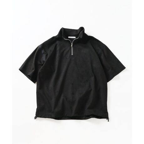 フェイクスエード素材を使用した、ハーフジップデザインの半袖Tシャツ。やわらかな肌触りとマットな光沢感で、1枚でもサマになる大人の一着。胸元のジップがさりげないアクセントに。デニムやワイドパンツと合わせて、上品カジュアルなスタイリングにおすすめです。