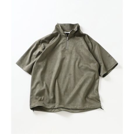 フェイクスエード素材を使用した、ハーフジップデザインの半袖Tシャツ。やわらかな肌触りとマットな光沢感で、1枚でもサマになる大人の一着。胸元のジップがさりげないアクセントに。デニムやワイドパンツと合わせて、上品カジュアルなスタイリングにおすすめです。