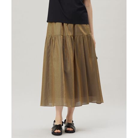 軽い質感とメタリックな光沢感が魅力のスカート■デザインしなやかでメタリックな光沢感を生かしたギャザースカートです。ギャザーから生まれる素材の凹凸が、シャンブレーの奥行のあるカラーを際立たせています。ウエストはグログランテープ見えの総ゴム仕様で、ウエストベルトがもたつかずすっきりと見えつつ快適な着心地です。高めの位置からティアードを切り替えたデザインもポイントです。メタリックな光沢感がありながらもシアーな素材なので、重くなりすぎず華やかで抜け感のある印象です。シンプルなTシャツと合わせても華やかで大人っぽく、新鮮な印象です。イギリスの老舗ティーハウスFarrer’s(ファーラーズ)とのコラボレーションアイテムです。【Farrer’s】英国湖水地方で200年以上続くティーハウス。ホテル、レストランをはじめ現地の方々に愛される紅茶は、軟水向けにブレンドされているため、日本でも変わらない味が楽しめます。歴史ある建物でもあるティーハウスでは、美味しい英国菓子や紅茶を求め、連日お客様で賑わっています。■素材ナイロンと綿糸の光沢の違いが生み出す、メタリックな光沢感が印象的なツイル素材です。綿とナイロンの色に差をつけることで、奥行きのあるシャンブレーの色合いが特徴です。程よくシアーな素材で、しなやかで薄く軽い質感と、綿のナチュラルで肌離れの良いタッチもポイントです。■同素材アイテムTブラウス(BLW7GM0513)