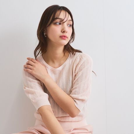 関連ワード:QUEENS COURT クイーンズコート ニット ポリエステル レーヨン ナイロン クルーネック フェミニン 半袖 通勤 2025春夏 2025SS 夏 夏服