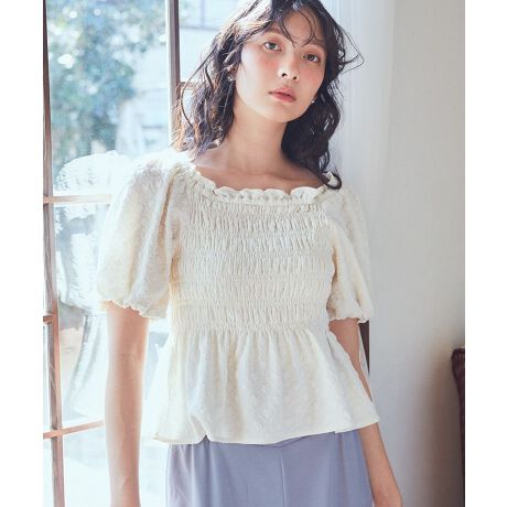 ぽこぽこしたジャーガード生地でフェミニンに仕立てたデザインブラウス。シャーリング仕様の身頃に、ふんわりと広がる短丈デザインが旬なスタイリングを後押しします。オフショルダーとしても着用出来る2WAYスタイルも嬉しいポイント。どんなボトムも着合わせしやすく、コーディネートの主役におすすめのアイテムです。透け感[なし]