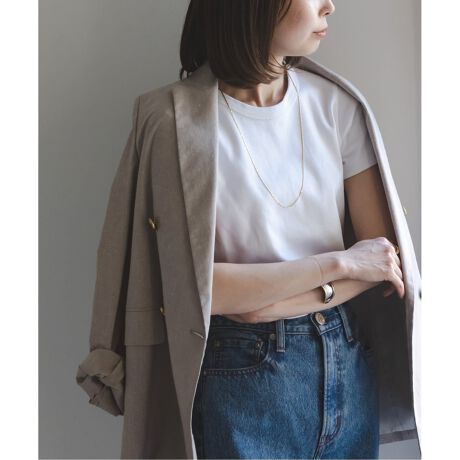 着心地: Tシャツですがややハリのある風合いなのでカジュアルになりすぎず、オフィスルックやジャケットのインナーにもおすすめです。