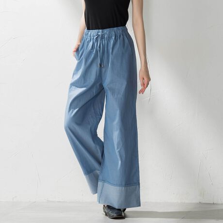 夏らしい薄手ダンガリー素材のワイドパンツ。
