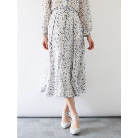 春夏らしい爽やかな単色プリントと、裾にかけて優雅に広がるアシンメトリーなハンカチヘムが女性らしさと新鮮さをアップしてくれる主役級スカート。