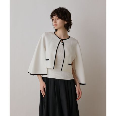 バイカラーのトリミングデザインがポイントになった、クラシカルな雰囲気薫るカーディガン。綺麗めな印象で羽織れるようミラノリブの編地を採用。美しい目面としっかりとした編地が特徴で、伸縮性が少なく型崩れしにくいのがポイントです。 羽織ると袖のスリットから腕が覗く女性らしい華奢さを感じられる、ケープスリーブのようなデザインがポイント。バランスの良い短めの丈感で、スタイルアップにもなる一枚です。お揃いのタンクトップと合わせたアンサンブルスタイルにすれば、セレモニーシーンやお食事会にもおすすめです。