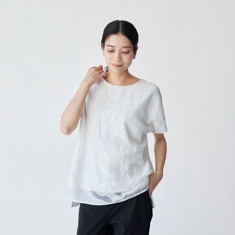 タイガー柄の顔を大胆に大きくオパール加工を施した布帛素材と、綿天竺のジャージーコンビ。いつもより抜けた部分が大きい分、下のカットソーとの濃淡差で柄が浮き出てくるような、涼し気な雰囲気です。
