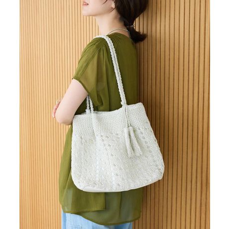 光沢ある素材で仕立てたアクセントに最適なトートバッグ。マクラメデザインのソフトな抜け感を活かしたナチュラルな雰囲気も特徴です。長めの持ち手はコード編みでスタイリッシュに仕上げ、同素材のタッセルアクセントもおしゃれなポイントに。内布付きで収納しやすく、コンパクトながら容量があるのも嬉しいデイリーにぴったりのアイテムです。※モデル着用画像は、光の当たり具合で色味が違って見える場合がございます。※お使いのモニター環境によって商品の色味が違って見える場合がございます。