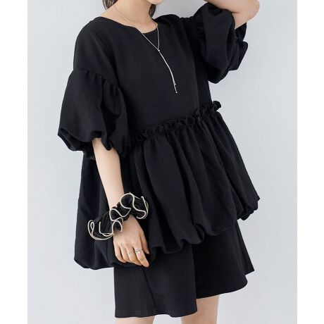 ウエストのギャザーからふわっと広がる裾と、丸みのあるボリュームスリーブが、大人の可憐さを引き立てます。