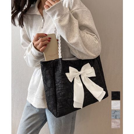 上品な光沢感と立体感のある生地が魅力のリボントートバッグ。