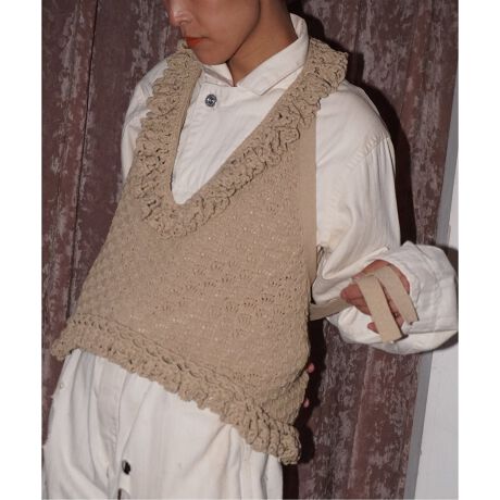 コンパクトながら華やかさを兼ね備えるニットビスチェ。クラフト感のある粗野な糸を使ったカギ編みのフリルパーツをネックとヘムに施して動きを出し、アイキャッチなシルエットに。身頃も柄編みにし、価値観のある1枚に仕上げています。タンクトップやTシャツに重ねるのはもちろん、夏にはベアトップなどと合わせて1枚で潔く着て頂くのがおすすめです。