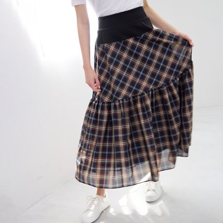 やわらかなオーガンジー素材を使った贅沢なフレアシルエットながらも、品の良いチェック柄やシックなカラーが、大人な表情を演出するロングスカート。