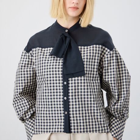 ボタン&ループで簡単に取り外し可能なボウタイが付いており、タイを外せばシンプルなバンドカラーシャツとしても着用できる便利なデザインです。