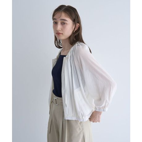 ソフトタッチでエアリーなシアー素材で仕立たデザインブルゾン。柔らかな透け感が優しい印象を演出してくれる一枚です。ゆったりとしたラグランシルエットにギャザーゴムでより丸みのあるフォルムを強調。スタイリングに合わせて調節可能な首元のドロストリボンもポイントです。レイヤードに程よい抜け感をプラスしてくれるこれからのシーズンにぴったりのアイテムです。透け感[あり]