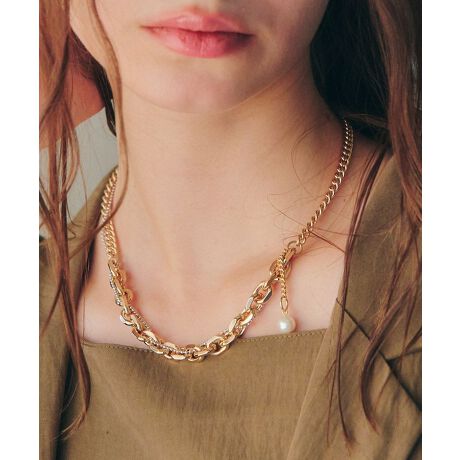 アシンメトリーデザインが洒落感溢れるネックレス。 形とボリューム感の異なるチェーンをMIXしたユニークなひと品です。艶めくパールビーズが上品なアクセントに。太幅ショート丈がコーディネートに映え、プラスするだけでシンプルな装いを明るく華やかに演出してくれます。※モデル着用画像は、光の当たり具合で色味が違って見える場合がございます。※お使いのモニター環境によって商品の色味が違って見える場合がございます。