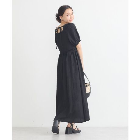 1枚でフェミニンなコーディネートに決まるロングワンピース。見頃部分のシャーリングディテールやバックリボンが差をつける魅力的なデザインです。前後スクエアネックで顔まわりをすっきりとした印象に。ポコポコとした表面感のある爽やかな素材が、より夏のシーズンムードを高めてくれる今季おすすめのアイテムです。透け感[なし]