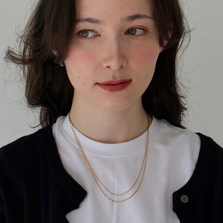 異なるデザインのチェーンが絶妙なバランスで重なり、首元に上品でオシャレなニュアンスをプラス。