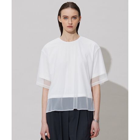 ■デザインビッグTEEを二枚重ねしたデザインで、シアーな素材感が際立つデザインとなっています。ややワイドなシルエットながらも、チュール素材の柔らかさと軽やかさで涼しげな印象を持った一枚です。
