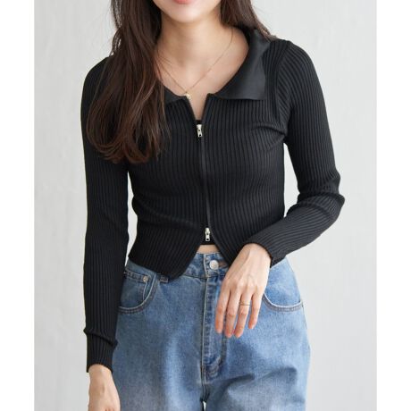 ショート丈とダブルジップ仕様で、着こなしの幅が広がるリブニット。