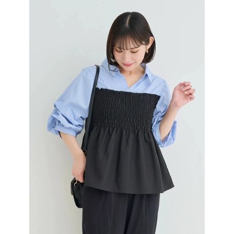 シャツにビスチェをレイヤードしたようなドッキングデザインのトップス。