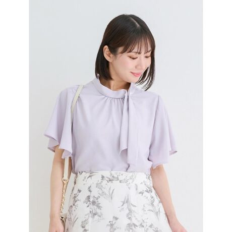 上品な艶のあるパール付きスカーフタイがエレガントなムードを演出するブラウス