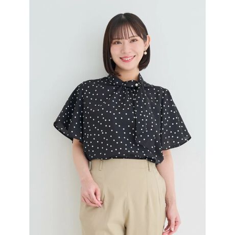 上品な艶のあるパール付きスカーフタイがエレガントなムードを演出するブラウス