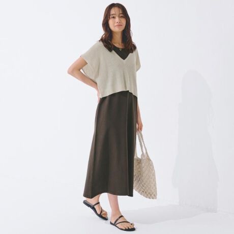 Vネックで丸首のワンピースと、レイヤードした時の衿ぐりバランスの着こなしがお洒落見えします。