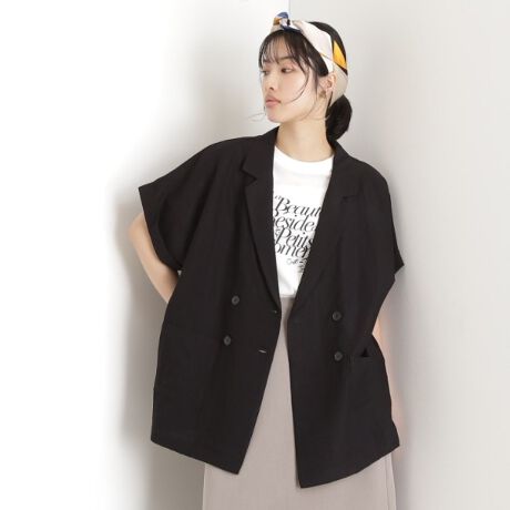 この半袖テーラージャケットは、Wブレストデザインが特徴で、スタイリッシュさを兼ね備えています。
