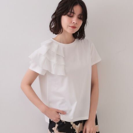 肩にフリルをあしらった、アシンメトリーなデザインが魅力のカットソートップス