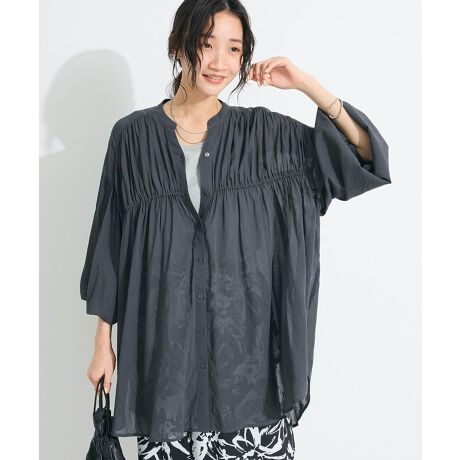 スキッパーネックにボタンダウンのすっきりとしたディテールにシャーリングアクセントを加えたシーズナルな一枚です。