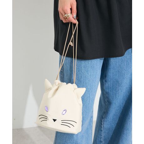 *可愛らしいネコのデザインが特徴のパフネコ巾着ショルダー。ファッションに遊び心を加えるアクセントとして、大人にもビジネススタイルにもカジュアルにもマッチします。