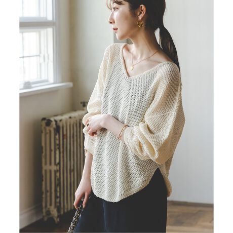 ぺーパーヤーンを使用したシャリ感のある独特な風合いに、表面感のある編地が清涼感漂うニットプルオーバー。