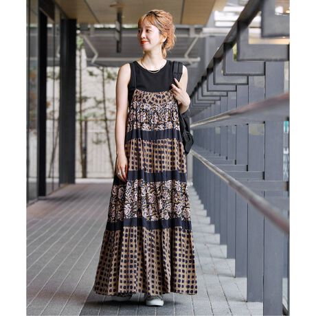 インド綿ならではの程よいカジュアルな雰囲気と軽やかさが特徴です。裾に向かってボリューム感で出るティアードギャザーにし、涼しく体型カバーもできちゃう優秀なアイテム。花柄と幾何柄の組み合わせも色目が統一されているので馴染みがよく他にはないワンピースとなっています。