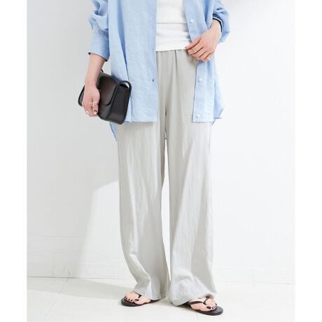 サテンほどとろみがなく程よいハリ感のあるセルロース系、微光沢なカルゼ目の涼しげな素材を使用しています。ワッシャー加工によるナチュラルなシワ感がこなれた印象で肌離れもよく、クセのないセミワイドストレートシルエットになります。