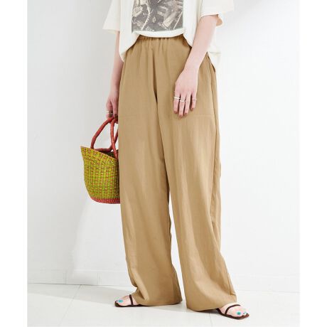 サテンほどとろみがなく程よいハリ感のあるセルロース系、微光沢なカルゼ目の涼しげな素材を使用しています。ワッシャー加工によるナチュラルなシワ感がこなれた印象で肌離れもよく、クセのないセミワイドストレートシルエットになります。