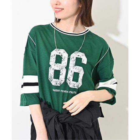 ヴィンテージ感のあるかすれたプリントと、袖やバックに入ったラインがアクセントに。