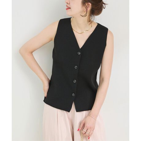 タンクトップのような感覚で着られるコンパクトなニットベストです。深めのVネック開き、バックスリットなどすっきり見えするディティールになっています。